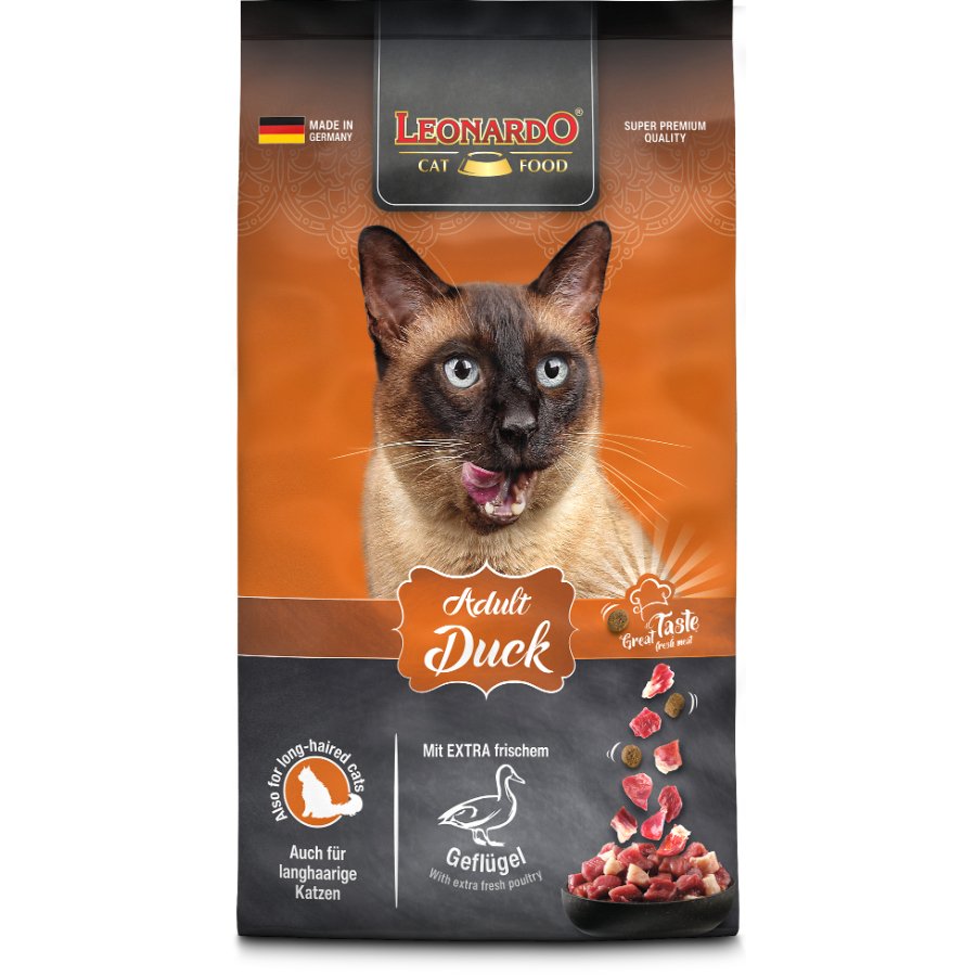 LEONARDO® Adult Duck es una variante de delicioso sabor para los gatos amantes de la carne de ave. Además, la receta se ha mejorado con semillas de chía y con sabroso krill, el crustáceo procedente de la Antártida. Su alto contenido en ácidos grasos omega-3 y lecitina contribuye a conservar una piel sana y un pelaje brillante.